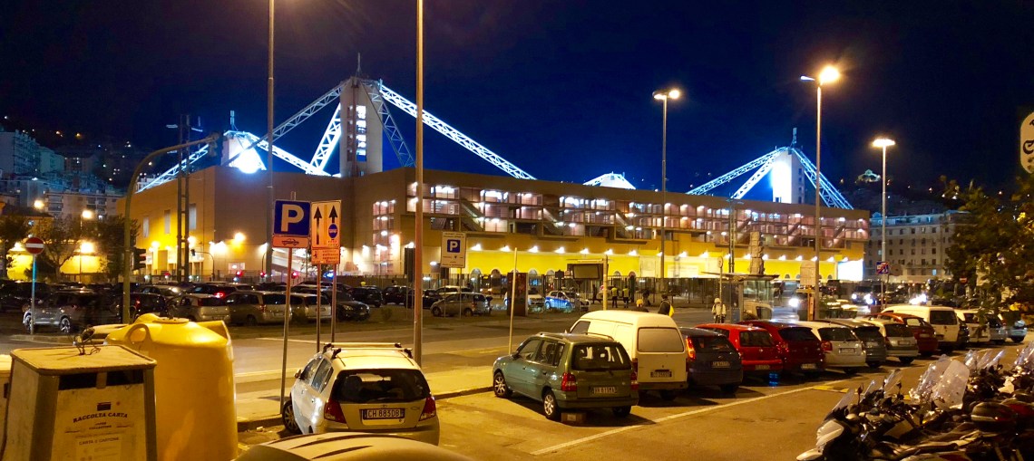 The journey from Milano had brought us along the A7, meandering for the last 30km through a sequence of sweeping bends that followed the contours of the landscape. We parked the car on Corso Monte Grappa, and began the spectacular descent down to the stadium. From the hillside we stole glimpses of the outline of the Marassi through gaps between the buildings, backlit by homes on the adjacent hillside. The distant rumble of traffic and sirens from somewhere in the darkness down below built the sense of anticipation. Eventually, we came to the Scalinata Montaldo; a vertigo-inducing flight of 280 steps taking you steeply down to the river, ultimately revealing a full view of the stadium from ground level. A fabulous way to approach the ground, but with the inevitable drawback of a return journey after the game.