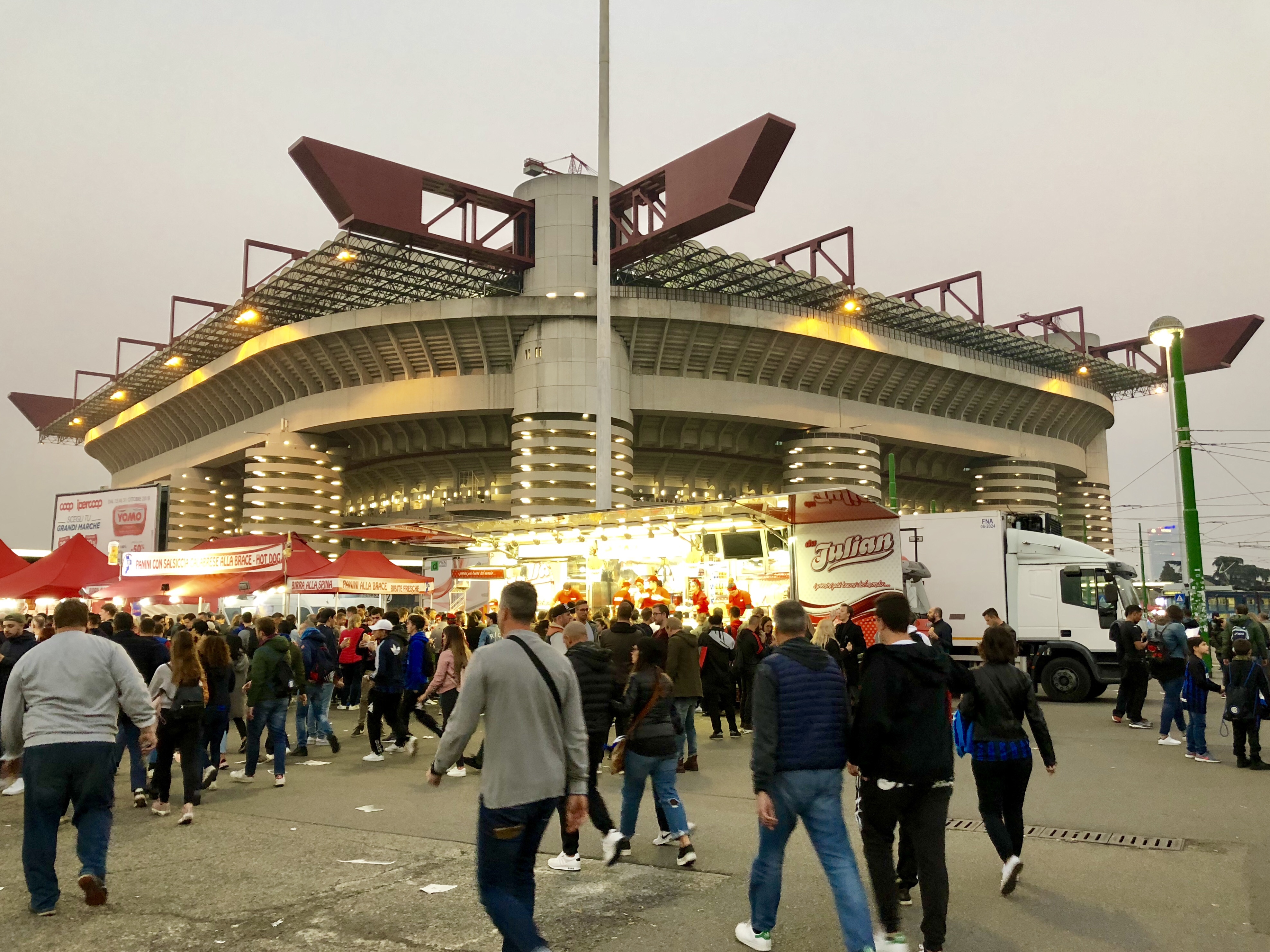 Game day finally arrived, the light was just beginning to fade as I parked up about a mile west of the stadium. I joined the crowds heading towards the stadium and it wasn’t long before I got first sight of San Siro through the trees of Parco Aldo Aniasi. Marching onwards, the hairs standing up on the back of my neck, those sparse surrounds of the stadium were transformed. Even several hours ahead of kick off, throngs of tifosi spilled out from the San Siro Metro station and headed towards bright lights and chrome of the food vans selling panini and beers. The scene resembled London Waterloo at rush hour; some groups in no obvious hurry were content to congregate, whilst others darted for the various entrances keen to take their seats. Making any kind of progress through the crowds was a slow and precarious business.