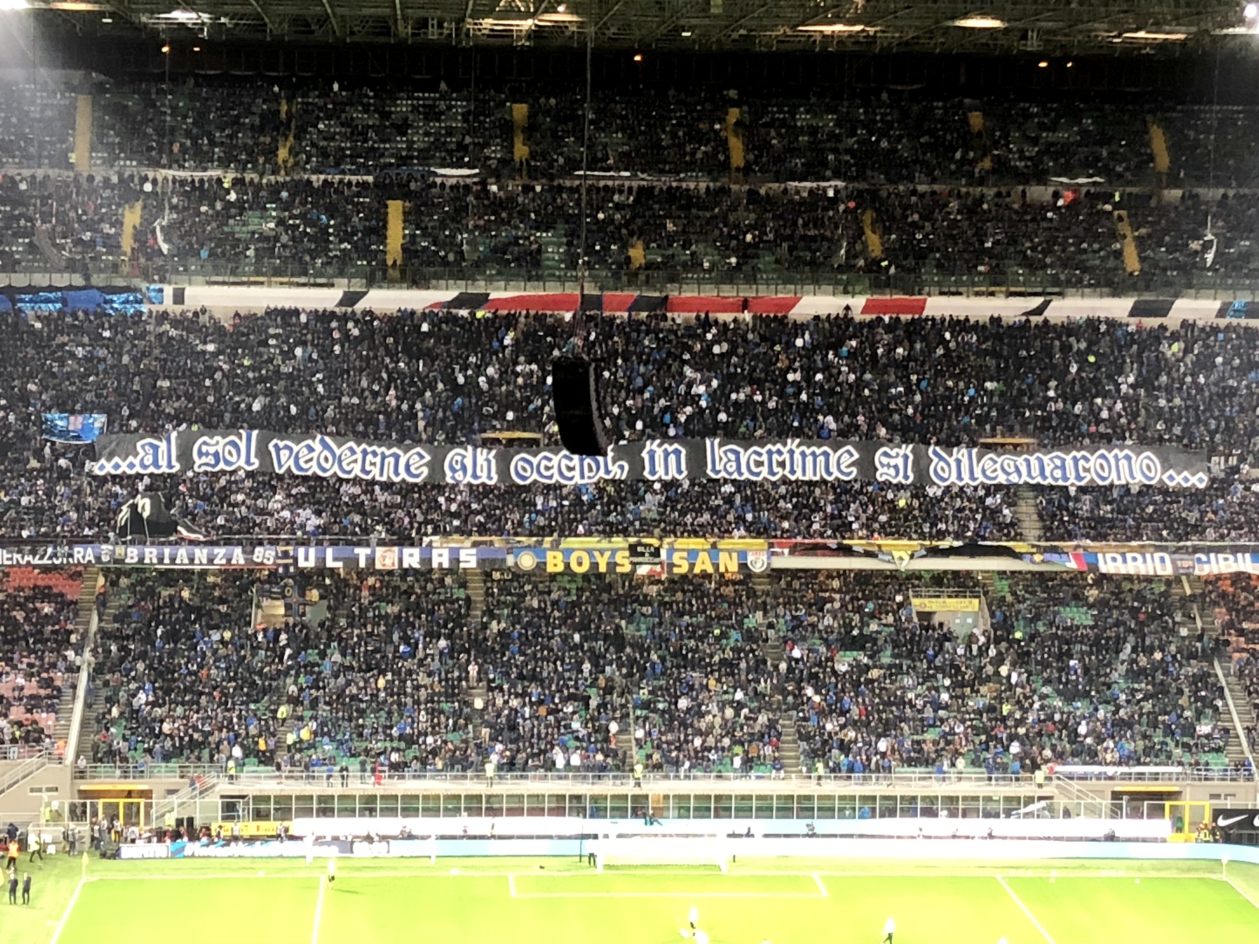 The massed ranks of the Carabinieri lurked ominously in the background, although the mood around the ground was buoyant and good natured. That calm was soon to be shattered by the not-too-distant boom of a pyrotechnic explosion, marking the arrival of the Milan ultras. The sea of Inter fans parted as people hurriedly moved out of the path of the marching, chanting ultras. At once the atmosphere was dialled up. Simultaneously, the volume from inside the stadium rose, as if the Inter ultras already assembled in their Curva were telepathically aware of what was unfolding outside.