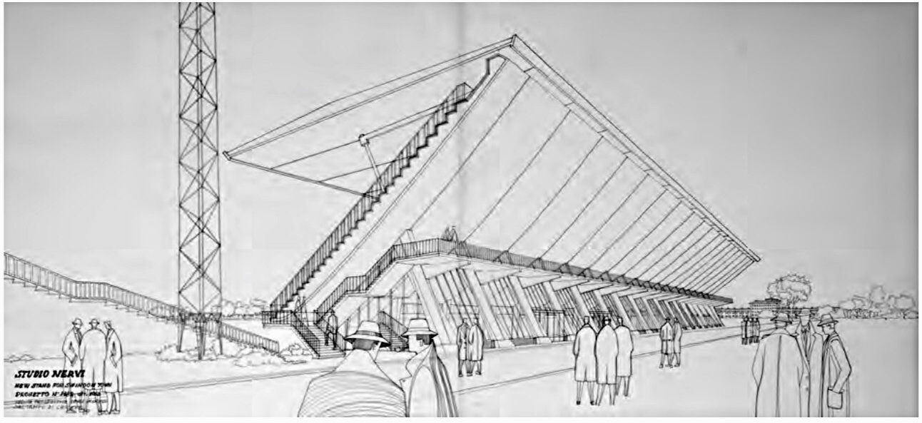 Studio Nervi set about their designs without delay, responding in November 1963 with drawings and calculations for two subtly differentiated solutions to meet the specification. The graceful designs did not disappoint. They featured many of Nerviโs hallmarks, including the quasi-cantilevered roof and exposed structural facets. In fact, Nervi had taken this one step further with the inclusion of a glazed facade in the lower part of the stand, accentuating the sense of simplicity and transparency.