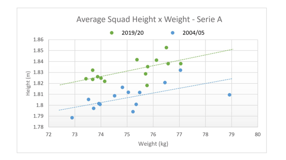 There has been a universal increase in the average height of Serie A squads in 2019/20 compared to 15 years earlier. Over a relatively short period of time, the average height has increased by 2-3cm (vertical shift of best fit line). This is a trend also observed in another academic studies focusing on other leagues and covering longer time periods.