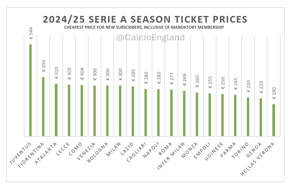 The exceptional case, leading the way by a considerable margin is Juventus at 544 euro (£24.68 per game). Behind them, we find Fiorentina at 350 euro (£15.88 per game). This represents a large increase on last season for La Viola as they contend with a reduced capacity at Stadio Artemio Franchi in 2024/25.